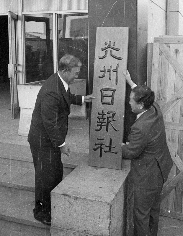 | 1980년 12월 1일 김종태 전 사장 등이 걸고 있는 광주일보사 현판. <광주일보 자료사진> |