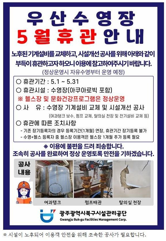 29일 광주 북구시설관리공단 등에 따르면 광주북구건강복지타운 우산수영장이 시설개선 공사를 위해 5월 1일부터 31일까지 휴관한다.
