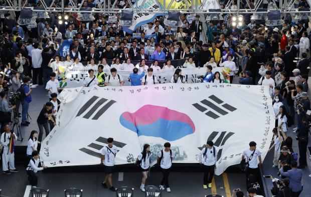 오후 6시 40분께 신명나는 풍물패의 행진에 뒤이어 ‘5·18 왜곡근절’, ‘5·18정신 헌법전문 수록’, ‘완전한 진상규명’ 등 깃발을 든 행렬이 금남로로 행진해 오자, 기다렸던 시민들은 환호성과 박수로 맞이했다.