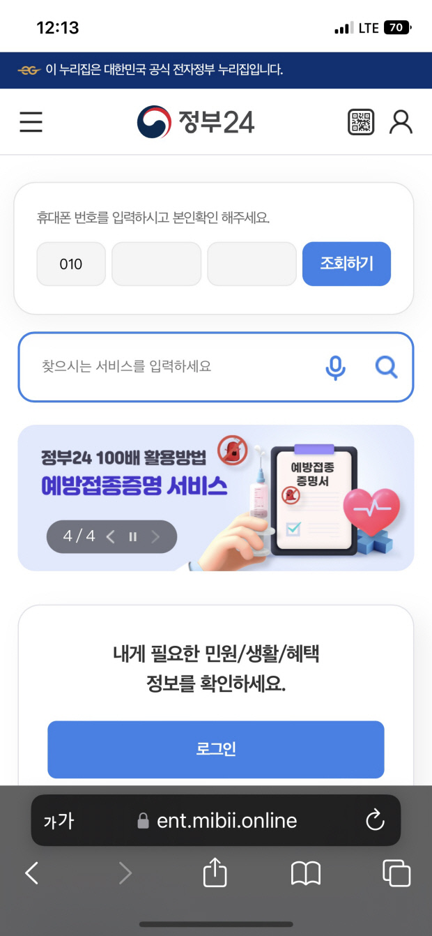 | 스미싱문자에 포함된 URL을 클릭하면 휴대전화 번호 입력을 요구하는 정부24 사칭 홈페이지로 연결된다.<독자 제공> |