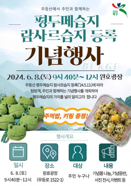 북구는 8일 무등산국립공원 원효광장(무등로 1522-1)일원에서 ‘평두메습지, 람사르습지 등록 기념행사’를 연다고 6일 밝혔다.