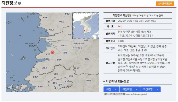 전북 부안군에서 규모 4.8의 지진이 발생했다.