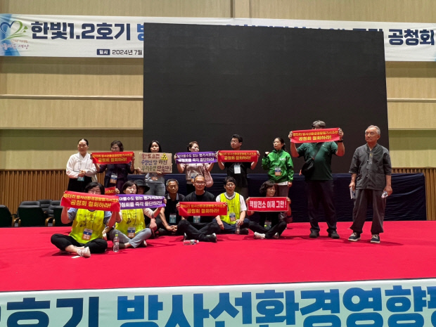 주민과 환경단체는 행사 시작 30분전 공청회장에 들어가 “주민 동의 없는 공청회가 무슨 소용이냐”며 전문가와 한수원 관계자들에게 항의했다.