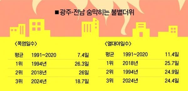 광주와 전남을 떼어놓고 보면 광주 폭염일수는 1994년 45일, 2018년 43일, 2016년 31일, 2017년 29일, 2024년 25일순이었다.