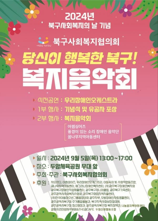 광주시 북구가 사회복지의날을 맞아 다채로운 음악회를 개최한다. 북구 사회복지협의회는 9월 5일 오후 1시부터 5시까지 두암체육공원 무대 앞에서 ‘당신이 행복한 북구! 복지음악회’를 연다고 28일 밝혔다.