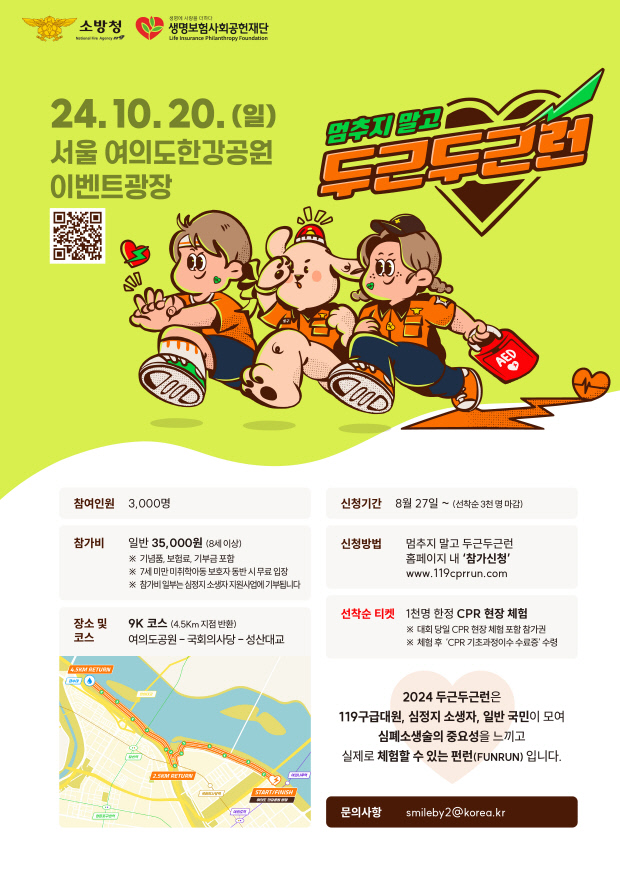 소방청 주최로 올해 처음 열리는 ‘두근두근런’ 마라톤 행사는 총 9㎞ 코스로 1㎞마다 심정지 환자 발견 시 필요한 심폐소생술 단계를 학습할 수 있는 펀런(FUN RUN)형식으로 진행된다.