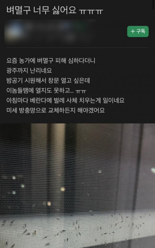 온라인을 중심으로 최근 광주 지역 주민들의 멸구류 피해 호소가 이어지고 있다. SNS와 온라인 커뮤니티 사이트 등에는 집 안으로 멸구류 수백 마리가 들어와 깜짝 놀랐다는 글이 연일 올라오고 있다.