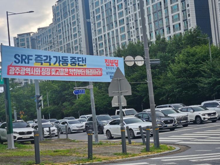 | 광주시 남구 행암동에 걸린 SRF시설 악취를 해결을 촉구하는 현수막. <독자 제공> |