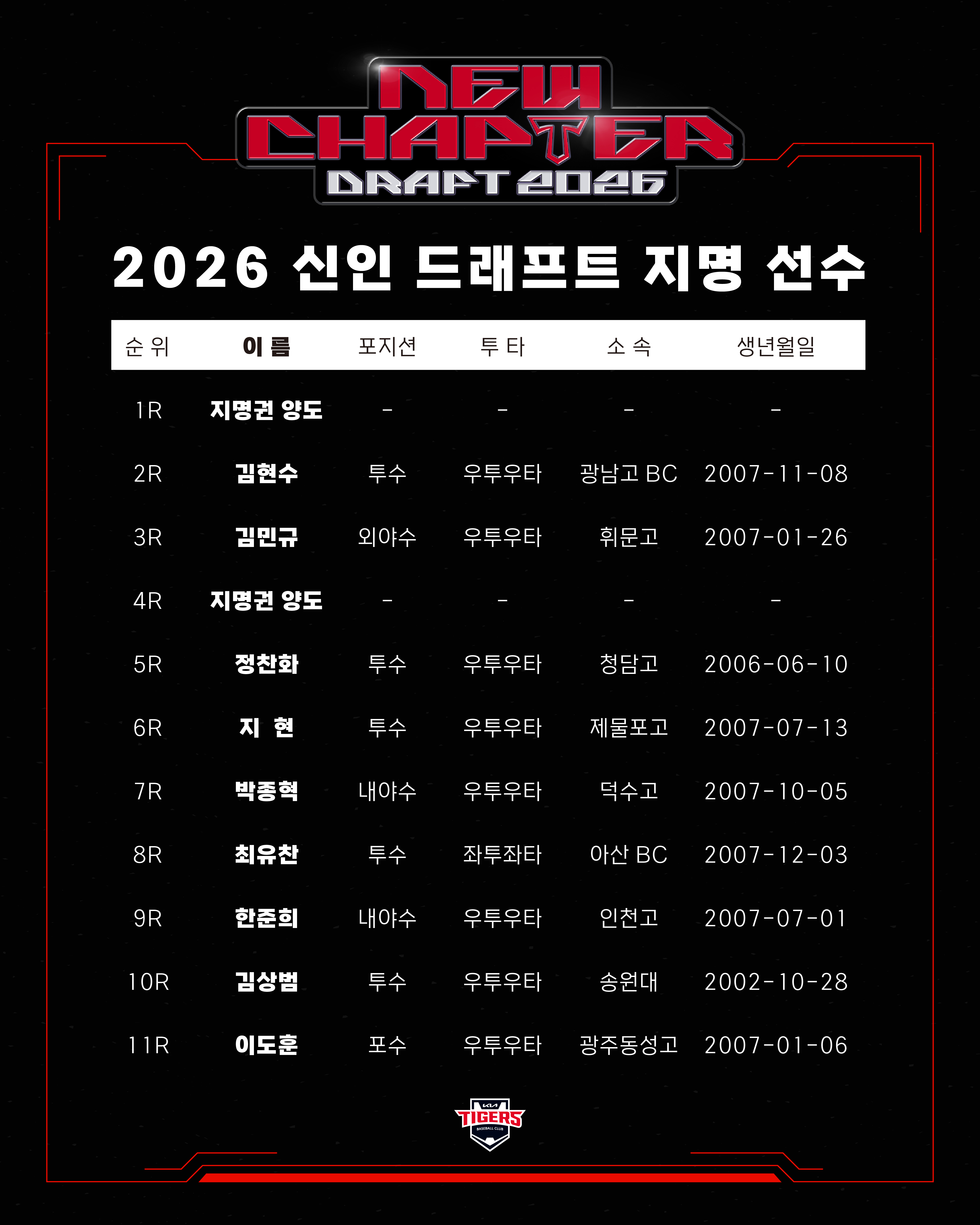 KIA 타이거즈가 ‘2026 KBO 신인 드래프트’에서 가장 먼저 광남고BC의 투수 김현수<사진>의 이름을 불렀다.