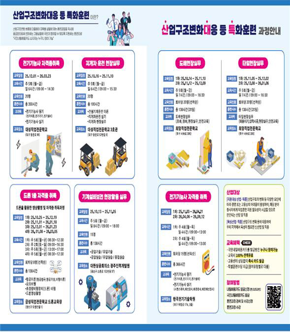 2025년 산업구조변화대응 등 특화훈련 과정에 대한 내용은 광주인자위 홈페이지 (http://www.gwangjuhrd.or.kr)를 확인하거나 광주인자위(062-350-5824)로 문의하면 된다.