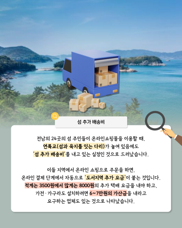 섬과 육지를 잇는 다리가 이미 개통돼 있음에도 불구하고 이른바 ‘섬 추가 배송비’를 내야 하는 실정인 것입니다.