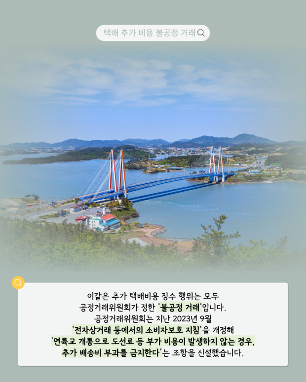 이 같은 행위는 공정거래위원회가 규정한 ‘불공정 거래’에 해당합니다. 공정위는 지난 2023년 9월 ‘전자상거래 등에서의 소비자보호 지침’을 개정하며, ‘연륙교 개통으로 도선료 등 부가 비용이 발생하지 않는 경우, 추가 배송비 부과를 금지한다’는 조항을 신설한 바 있습니다.