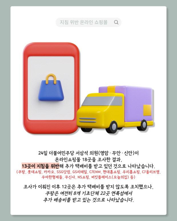 그러나 서 의원이 온라인 쇼핑몰 18곳을 점검한 결과, 13곳이 여전히 지침을 위반해 추가 배송비를 받고 있었고, 12곳은 위반 사실이 적발된 뒤 개선 조치를 완료했으나, 1곳은 현재까지도 8개 기초단체 22개 연륙섬에 대해 추가 요금을 부과하고 있는 것으로 드러났습니다.