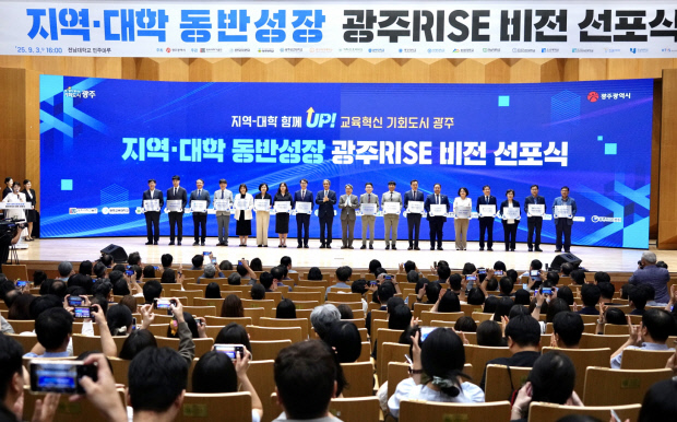 자치단체와 대학이 지역발전을 견인하는 ‘광주라이즈(RISE) 비전 선포식’이 강기정광주시장과 광주지역17대학 총장등이 참석한 가운데 지난 3일 전남대학교 민주마루에서 열렸다. <광주시 제공>