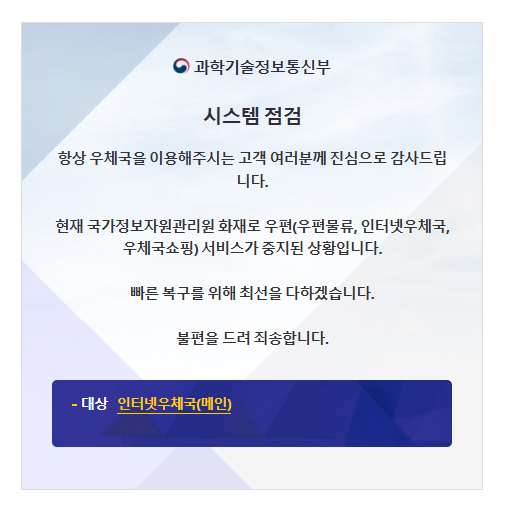 정부는 28일부터 중단된 정부 전산시스템 647개 중 직접 화재 영향이 없는 551개를 순차적으로 재가동 및 복구하고 있다. 특히 대국민 파급효과가 큰 우체국 금융, 우편 등 주요 정부서비스 장애부터 신속 복구할 방침이다.