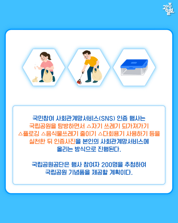 환경 정화 활동은 한려해상, 태안해안, 다도해해상, 변산반도 등 4곳의 해상·해안국립공원 바닷가에서 진행되며 국민참여 사회관계망서비스(SNS) 인증 행사는 국립공원 친환경 탐방후 인증사진을 본인의 사회관계망서비스(SNS)에 올리는 방식이다.