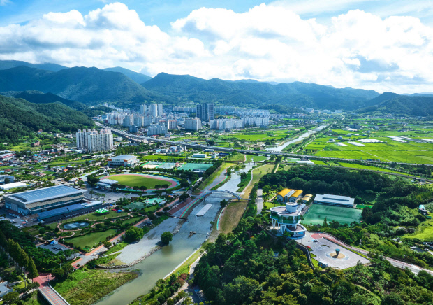 개미산 전망대와 화순천이 흐르는 화순 읍내 낮 전경. |