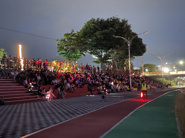 한여름 밤 관람객들이 꽃강길 음악분수 공연을 즐기고 있다.<화순군 제공> |