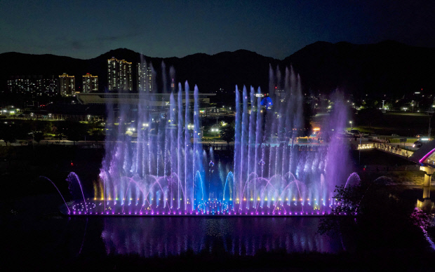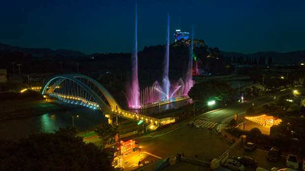 화순천 꽃강길 음악분수’가 뿜어내는 시원한 물줄기 너머로 개미산 전망대가 화려한 조명을 밝히고 있다.<화순군 제공> |