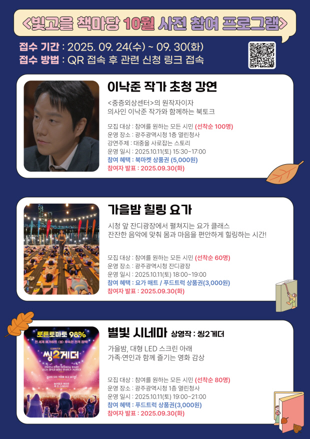 9일 광주시에 따르면 9월 ‘노벨 문학상·평화상’을 주제로 한 1차에 이은 이번 행사는 ‘책이랑 날자: 북(Book) & 락(樂)’을 슬로건으로, K-문학을 앞세운 참여형 독서문화 축제로 시민들을 맞는다.