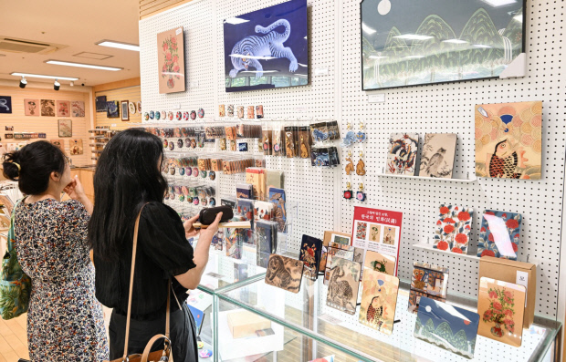 굿즈 개발은 2001년 조선민화박물관 시절로 거슬러 올라간다. “기념품이라고는 발마사지기 같은 천편일률적 상품뿐이던 때, 민화의 매력을 살린 엽서를 처음 만들었다”는 것이 오 관장의 설명이다. 이후 엽서를 시작으로 생활용품, 교구, 화방용품까지 영역을 넓혀왔고 코로나 시기에는 오프라인 운영이 막히자 직원 전원을 굿즈 개발과 온라인 사업으로 돌려 ‘율아트’라는 브랜드를 본격화했다. 그 결과 굿즈 라인업은 폭발적으로 늘어났고 최근에는 인천공항·청주공항 면세점, 대형서점, 아트박스 등 유통망까지 확장됐다.