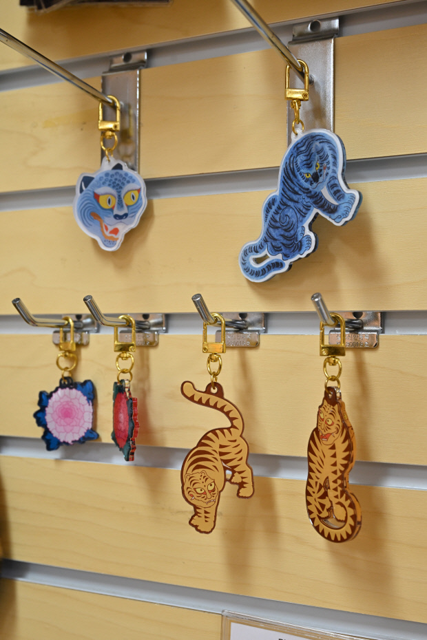 민화뮤지엄 1층에는 기념품을 판매하는 아트숍 ‘율아트’가 마련돼 있다. 가장 인기 있는 상품은 단연 ‘작호도’ 굿즈다. 키링 4종, 배지 4종, 문진과 티셔츠, 컵받침, 메모지, 자석 등 수십 가지 품목이 준비돼 있다. 작호도 외에 온라인몰에 등록된 상품만도 1500여 종에 달한다.