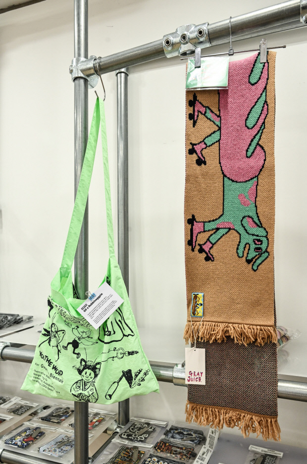 특히 올해는 한국 디자인 브랜드와 협업한 제품들이 눈에 띈다. 광주 아트숍과 로파(LOFA)가 함께 제작한 콜라보 상품, 다양한 브랜드 협업 굿즈가 전시와 어울리게 기획됐다. 설화 속 바리데기 이야기를 담아낸 디자인 ‘바리데기 가방’과 액운을 막아준다는 상징을 담은 물고기 인형도 인기다.