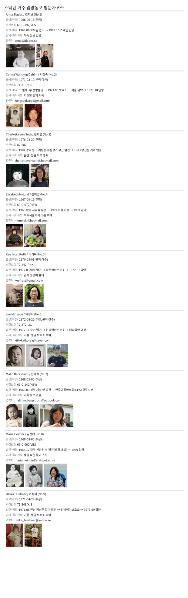 이중 한명은 1981년 광주 동구 계림동 대림상가 부근에서 발견돼 전남영아일시보호소와 영신원을 거쳐 1983년 입양됐다. 다른 한명은 1968년 전남 함평군 시골길에서 미아로 발견돼 이듬해 스웨덴으로 갔다. 1972년 여수에서 발견돼 광주영아일시보호소 입소 후 같은 해 입양된 사연도 있다.