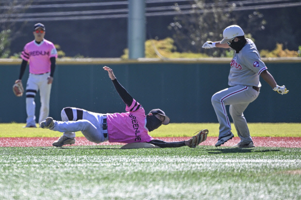 11일 함평야구장에서서 열린 THE J와 저져스의 ‘제15회 무등기 광주·전남 사회인 야구대회’ 광일리그 8강전에서 저져스의 박남필이 4회 1사 2·3루에서 적시타를 날린 뒤 2루에서 세이프 되고 있다. /김진수 기자 jeans@kwangju.co.kr