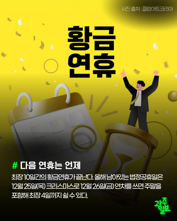 최장 10일간의 황금연휴가 끝난다. 올해 남아있는 법정공휴일은 12월 25일(목) 크리스마스로 12월 26일(금) 연차를 쓰면 주말을 포함해 최장 4일까지 쉴 수 있다.