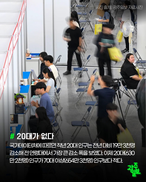 국가데이터처에 따르면 작년 20대 인구는 전년 대비 19만3000명 감소해 전 연령대에서 가장 큰 감소 폭을 보였다. 이제 20대(630만2000명) 인구가 70대 이상(654만3000명) 인구보다 적다.