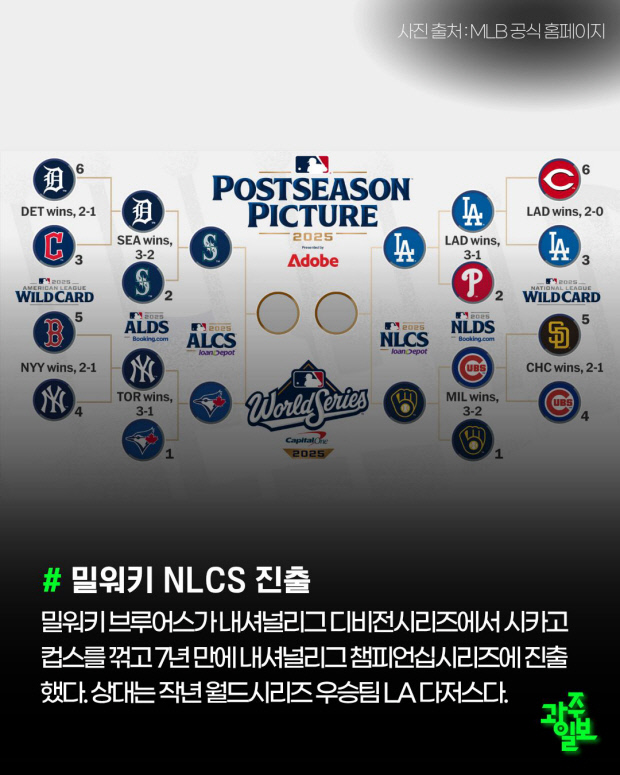 밀워키 브루어스가 내셔널리그 디비전시리즈에서 시카고 컵스를 꺾고 7년 만에 내셔널리그 챔피언십시리즈에 진출했다. 상대는 작년 월드시리즈 우승팀 LA 다저스다.