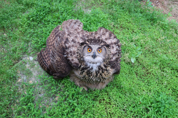 건물에 부딪혀 추락해 구조된 수리부엉이. |