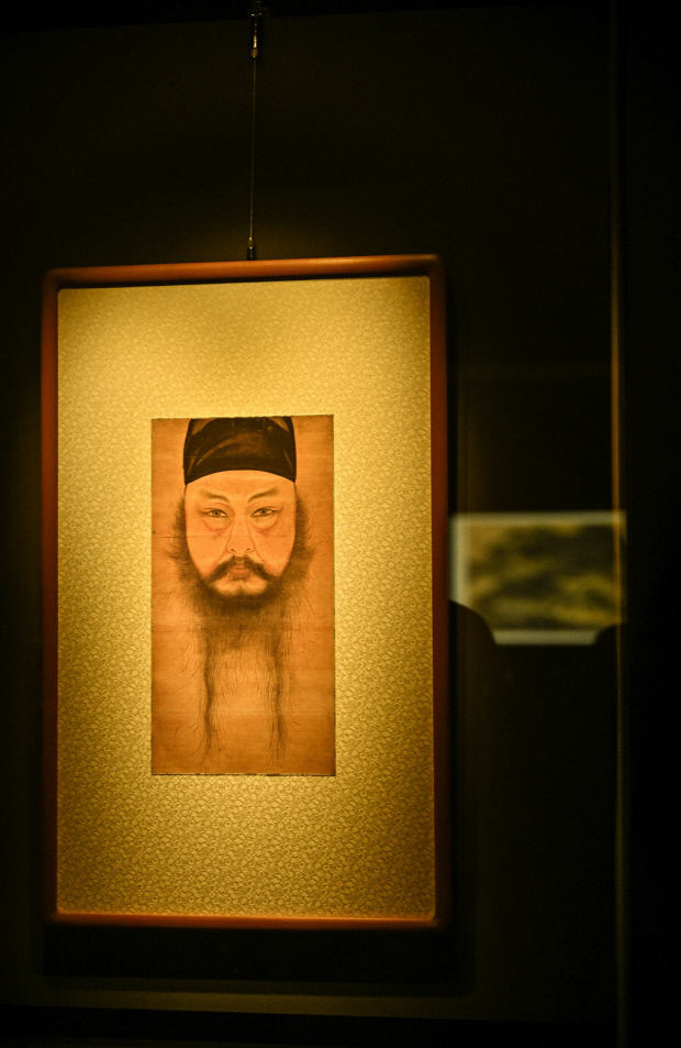고산윤선도박물관 ‘최고의 수묵 거장전 : 공재, 겸재를 만나다!’ 전의 윤두서 자화상 영인본. 바로 뒤에 겸재 정선의 ‘인왕제색도’가 걸려있다. /최현배 기자 |
