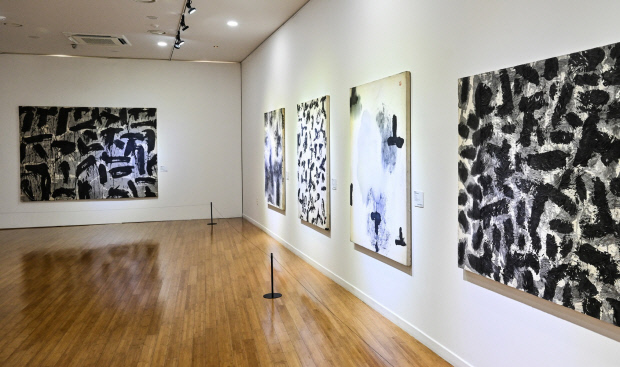 내고 박생광의 작품에서는 강렬한 오방색이 화면을 지배한다. 탈과 무속, 신화와 역사를 수묵의 선과 색으로 압축해낸 작가의 화풍은 수묵이 흑백의 영역에 머물러야 한다는 고정관념을 단숨에 깨뜨린다. 산정 서세옥은 여백과 선을 통해 인간 존재의 본질을 탐구했다. 단순한 획 하나, 점 하나에도 호흡과 리듬이 배어 있어 고요한 화면이 살아 움직이는 듯하다. 남천 송수남은 산수화의 틀 위에서 반복되는 붓질로 질서와 리듬을 쌓아 올리며 수묵의 현대적 가능성을 실험했다. 소정 황창배는 ‘무제’ 연작을 통해 과감한 색채 실험과 자유로운 형식으로 한국 수묵화의 전통을 갱신하며 새로운 조형 언어를 제시했다.