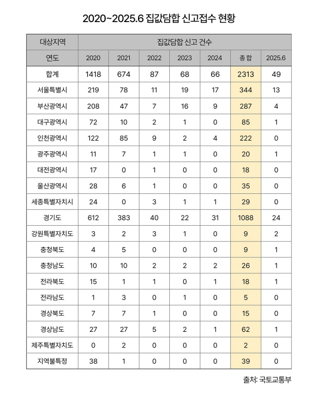 13일 국회 국토교통위원회 소속 더불어민주당 민홍철 의원이 국토교통부로부터 제출받은 자료에 따르면 최근 5년(2020∼2024년) 간 접수된 집값 담합 신고 건 수는 2313건으로 집계됐다.