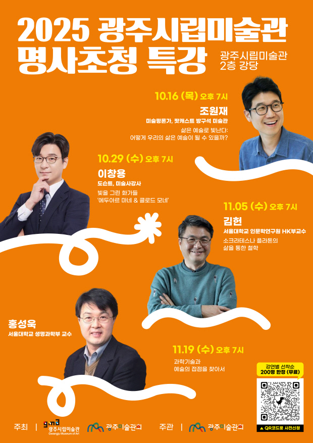 ‘광주시립미술관 명사초청 특강’이 10월~11월(오후 7시) 모두 4차례 진행된다. 이번 특강은 광주시립미술관(관장 윤익)과 (사)광주미술관회(회장 김영희)가 공동으로 주최하며 각 강좌 선착순 200명(무료) 가능하다.