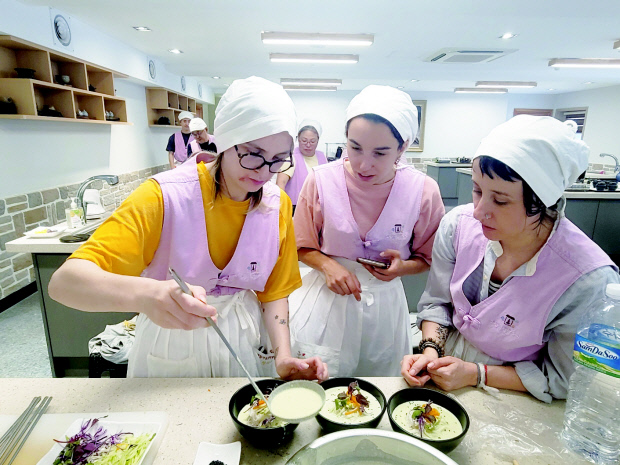 구례 화엄사가 마련한 ‘오색오미! 사찰음식에 빠져들다’라는 주제의 템플스테이에서 사찰 음식을 체험하고 있는 외국인 여행객들. |