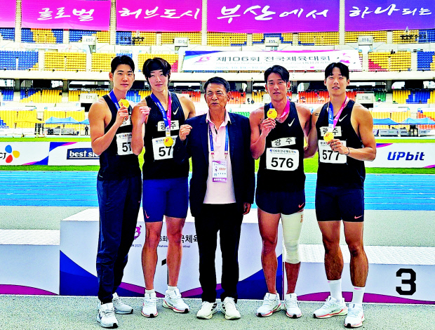 22일 부산 아시아드주경기장에서 열린 제106회 전국체육대회 육상 남자 일반부 1600m계주에서 금메달을 획득한 광주시청팀이 금메달을 목에 걸고 기념촬영을 하고 있다. 왼쪽부터 고승환, 김명하, 심재용 감독, 모일환, 이재성. <광주시체육회 제공>