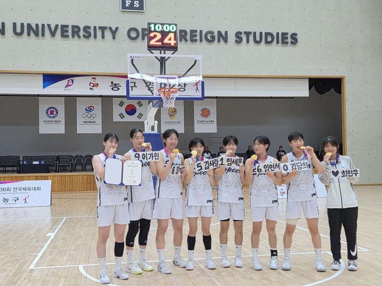 광주수피아여고 농구부가 23일 부산외국어대학교 체육관에서 열린 선일여고와의 전국체전 여고부 농구 결승전 후 시상식에서 금메달을 목에 걸고 포즈를 취하고 있다. <전남도체육회 제공> |
