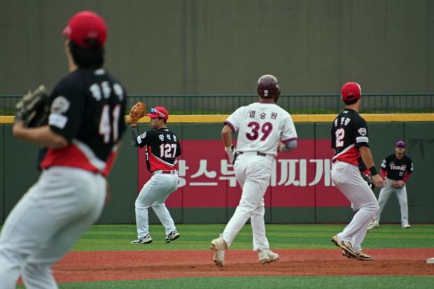 | 3회초 볼넷으로 출루한 장시현이 상대의 견제 때 1루로 귀루하고 있다. |