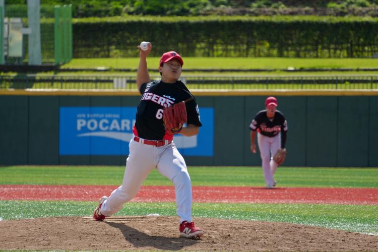 | 장재혁이 9회말 등판해 공을 던지고 있다. 3개의 볼을 연달아 던졌던 장재혁은 풀카운트 승부 끝에 원성준을 삼진으로 잡은 뒤 1사에서 어준서를 볼넷으로 내보냈지만, 전태현을 상대로 유격수 땅볼을 유도하면서 6-4-3 병살타로 경기를 마무리했다. |