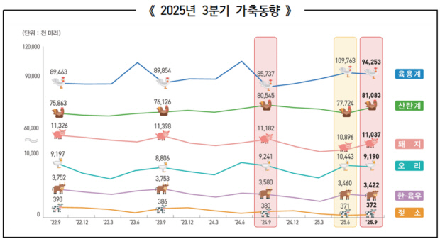 올 3분기 소·돼지 사육마릿수는 줄고, 닭은 증가한 것으로 나타났다. 특히 전국 닭 사육마릿수는 8100만 마리를 돌파하며 역대 최고치를 경신했다.