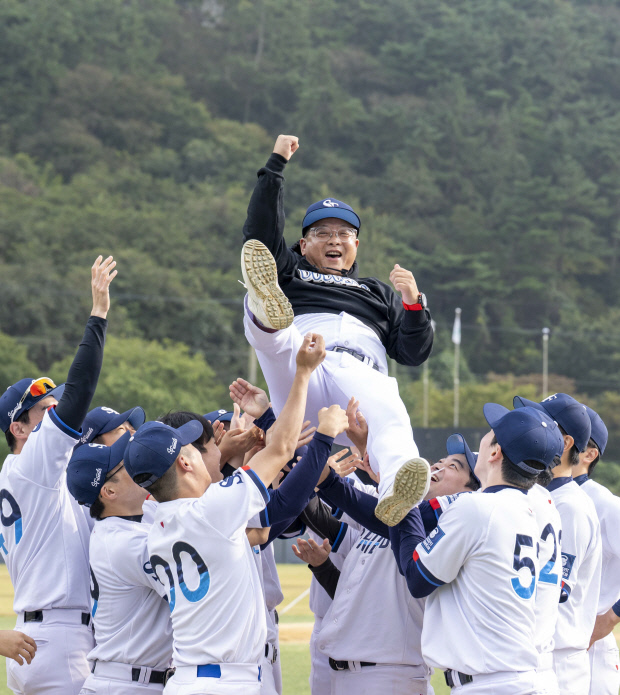 26일 함평 야구장에서 열린 제15회 무등기 광주전남 사회인 야구대회 무등리그 결승에서 우승을 차지한 센프렌즈 선수들이 김경노 감독을 헹가레치며 우승의 기쁨을 만끽하고 있다. /김진수 기자 jeans@kwangju.co.kr