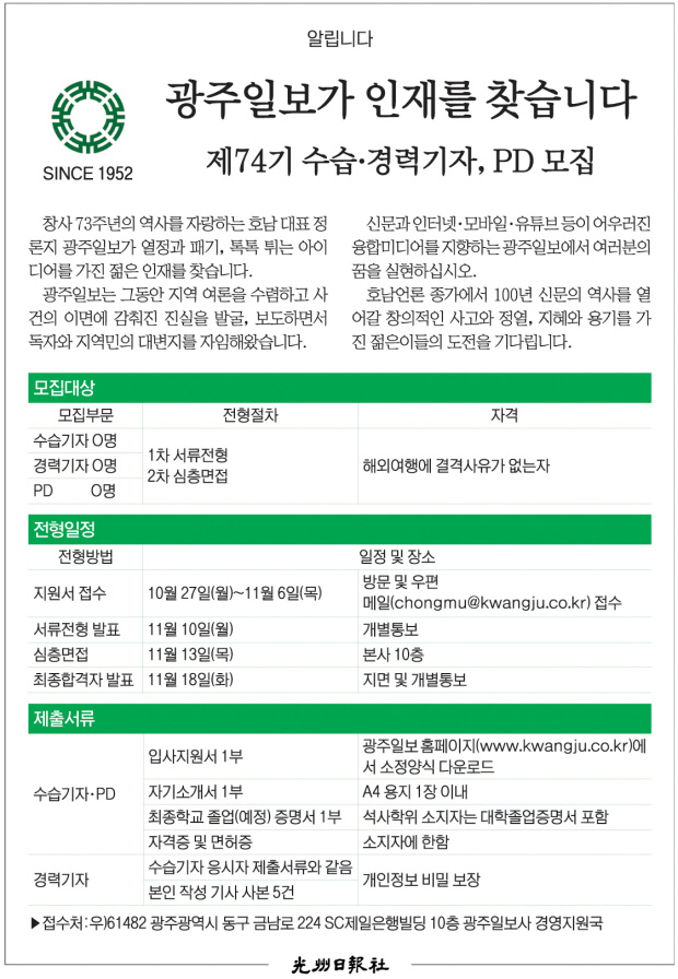 [광주일보가 인재를 찾습니다] 제74기 수습·경력기자, PD 모집