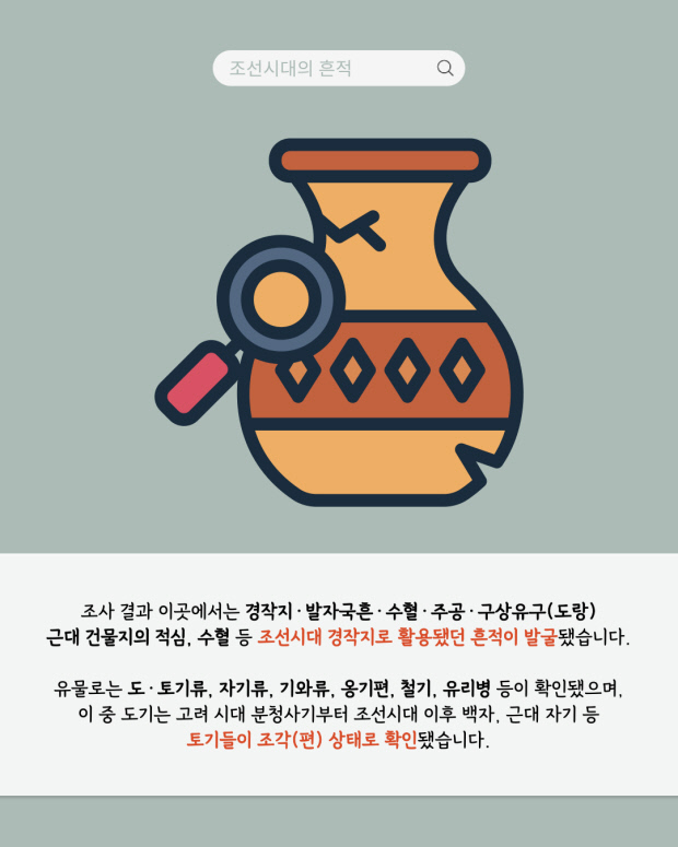 조사 결과 이곳에서는 경작지·발자국흔·수혈·주공·구상유구(도랑)·근대 건물지의 적심, 수혈 등 조선시대 경작지로 활용됐던 흔적이 발굴됐습니다.