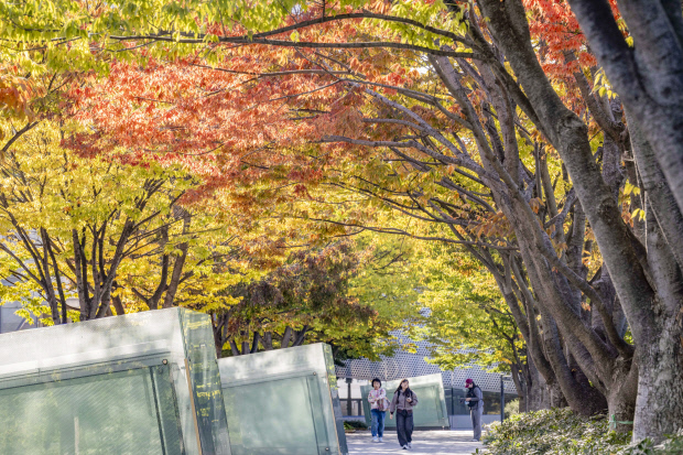 갑작스럽게 기온이 낮아진 가운데 27일 광주 국립아시아문화전당 산책로를 찾은 시민들이 붉고 노랗게 물든 단풍 아래를 걸으며 완연한 가을 정취를 만끽하고 있다. /김진수 기자 jeans@kwangju.co.kr