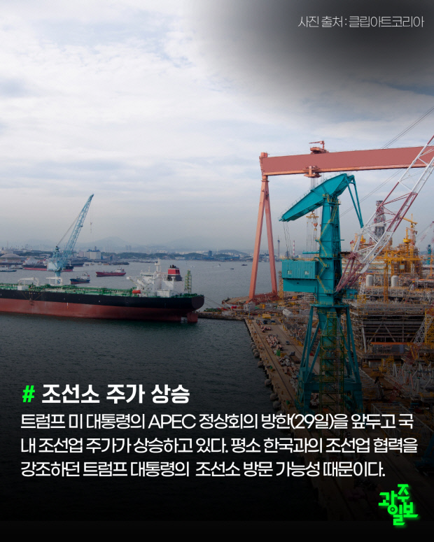 트럼프 미 대통령의 APEC 정상회의 방한(29일)을 앞두고 국내 조선업 주가가 상승하고 있다. 평소 한국과의 조선업 협력을 강조하던 트럼프 대통령의 조선소 방문 가능성 때문이다.
