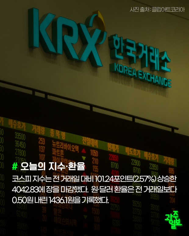 코스피 지수는 전 거래일 대비 101.24포인트(2.57%) 상승한4042.83에 장을 마감했다. 원·달러 환율은 전 거래일보다 0.50원 내린 1436.1원을 기록했다.