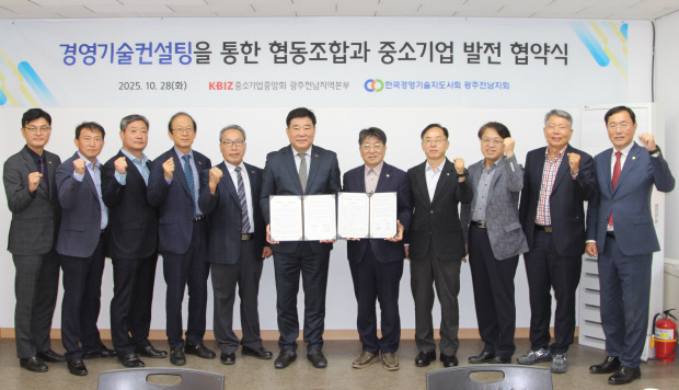 중소기업중앙회(중기중앙회) 광주전남지역본부는 “한국경영기술지도사회 광주전남지회와 경영 기술 컨설팅을 통해 지역 협동조합과 중소기업 발전을 도모하는 업무협약을 체결했다”고 28일 밝혔다.